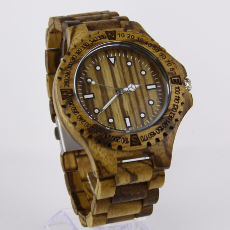Large wooden clock with quartz movement with date. Wood type: ZebranoMeasurements expressed in mm.Case Diam.: 45 Case Thickness: 13,60 Width. Band : 24.7 Mis. Attack: 13